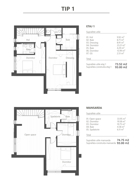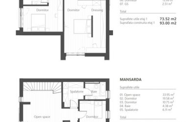 Mansarda: Zona open space/living/hobby room (40 m2), Dormitor (20 m2), Spalatorie (7m2), Baie (5m2).