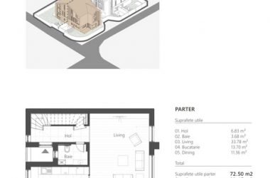 Parter: Living spatios cu zona de dinning (40 m2) si suprafete vitrate mari. Buctarie open/closed (19m2), grup sanitar, terasa;